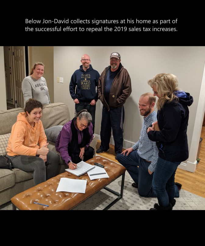 The picture here is Jon-David gathering signatures at his home as part of the successful effort to repeal the 2019 Sales Tax increases.